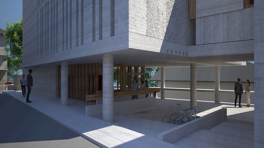 cemento armato. Rialzato e permeabile al piano terra, l’edificio è integrato e organico alla nuova piazza che,