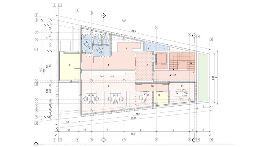 seconda fase 14). L’impronta planimetrica a trapezio si struttura su di una maglia di pilotis e sul corpo scale in