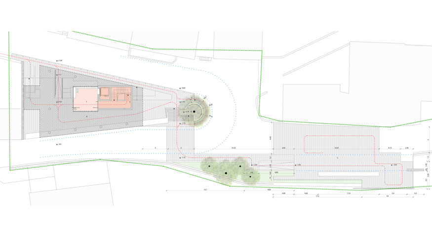 pedonale e l’attraversamento. Il basamento si configura come podio allungato sull’intero lotto di costruzione e